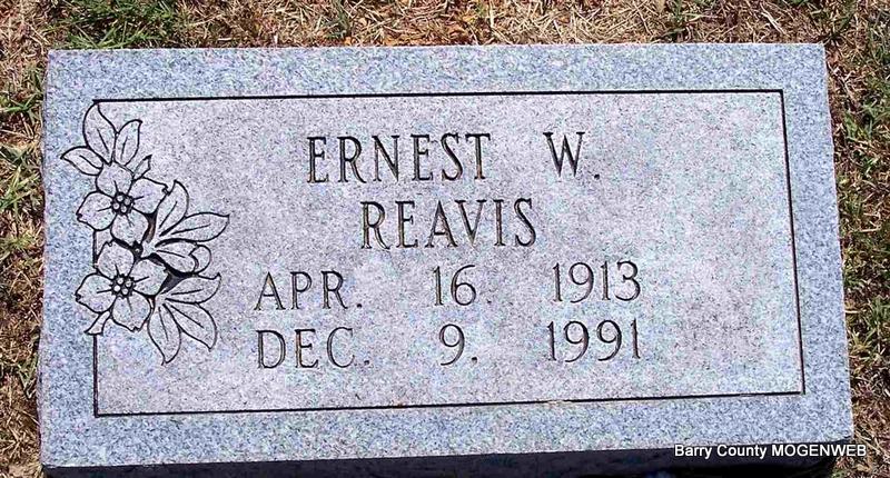 | REAVIS, Ernest W. | Apr. 16, 1913 | Dec. 9, 1991 | Research Note: Son of Jesse Homer Reavis and Bitha Bowling. 1940 census, Ernest W. is age 27 with wife Martilda Lorene (Eden), age 19, daughter Dorothy D. age 3, and Clarence E. age 8 months. Ernest W. Reavis, age 50, born Apr. 16, 1913, married Euvan E. White, age 41, born may 25, 1922, on Dec. 28, 1963 in Kansas City, Jackson Co., MO. | Census MO Marriage Records Phyllis Long Photo Diana Cope |