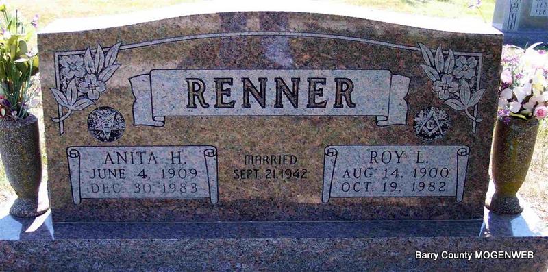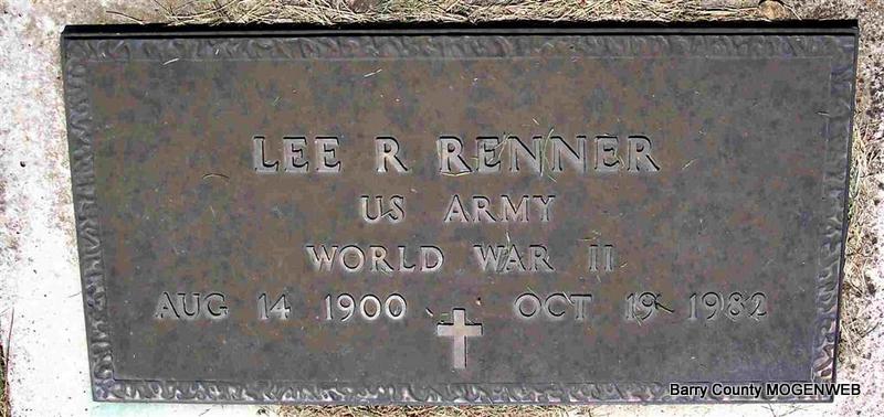 | RENNER, Roy Lee | Aug. 14, 1900 | Oct. 19, 1982 | SSW: Anita H. - Inscription: "Married Sept. 21, 1942" - Research Note: Roy Lee Renner first married Emma Slentz on Apr. 24, 1923 in Webster Co., MO. Son of John Franklin Renner and Sophia Keller. - Military Stone - Inscription: "US ARMY WORLD WAR II" | Census MO Marriage Records Phyllis Long Photo Diana Cope |