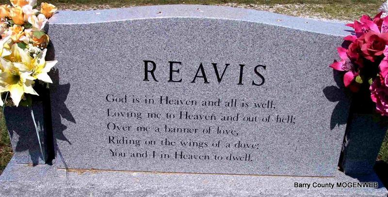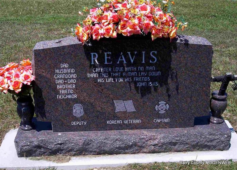 | REAVIS, Jerald Dean | Feb. 25, 1930 | May 16, 1977 | Research Note: Son of Leonard Uell Reavis and Lyndel Amanda Williams. Jerald Dean Reavis, age 25, married Shirley Joan Baker, age 19, on Sept. 23, 1955 in Crane, Stone Co., MO. Jerald Dean Reavis, age 30, married Sherryl Kay Shelton, age 21, on Dec. 29, 1960 in Lawrence Co., MO. | Census MO Marriage Records Phyllis Long Photo Diana Cope |
