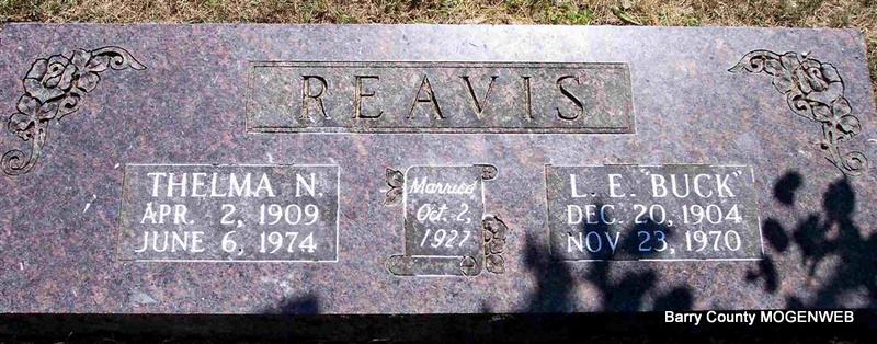 | REAVIS, Thelma Nadine (McCULLOUGH) | Apr. 2, 1909 | June 6, 1974 | SSW: L. E. "Buck" - Inscription: "Married Oct. 2, 1927" | Photo Diana Cope |