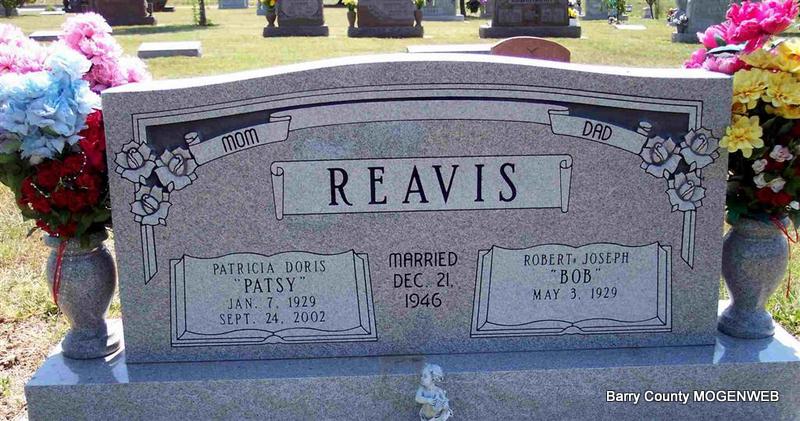 SSW: Patricia Doris "Patsy" - Inscription: "Married Dec. 21, 1946" - Research Note: Resident of Ozark Methodist Manor in Marionville, MO. Son of Loren Elmer Reavis and Thelma N. McCullough. Bob was known for his ability to play the steel guitar in the Reavis Brothers Band, along with six brothers. Bob and his brother Jerry built several homes and businesses throughout the Ozarks. Bob and Patsy owned and operated the Reavisville Market for several years while managing a mobile home park. | Census Peterson Funeral Chapel Phyllis Long Photo Diana Cope |