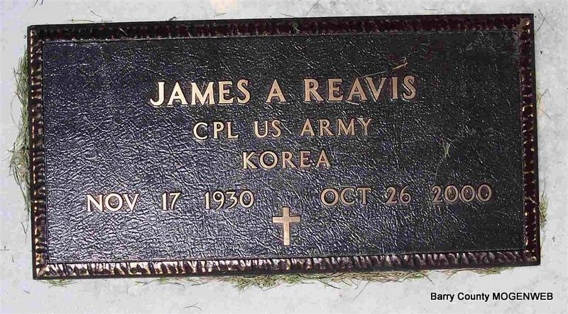 | REAVIS, James Arthur "Jim" | Nov. 17, 1930 | Oct. 26, 2000 | SSW: Viola May -Inscription: "Married Oct. 2, 1955" - Research Note: Son of Loren Elmer Reavis and Thelma N. McCullough. - Back of Stone - Military Stone - Inscription: "CPL US ARMY KOREA" | Census Phyllis Long Photo Diana Cope |