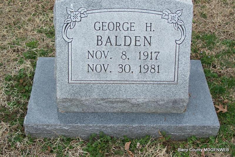 | BALDEN, George Henry | Nov. 8, 1917 | Nov. 30, 1981 | Research Note: Son of Lewis James Balden and Rena Nettie Price. His first wife was Esther. George Henry Balden, age 59, married Velma Caroline Matthews, age 54, on Oct. 1, 1977 in Monett, Barry Co., MO. | Photo Don Warner Census MO Marriage Records Phyllis Long |