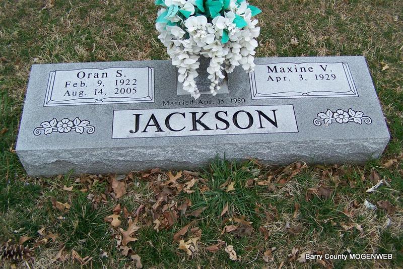 SSW: Maxine V. - Inscription: "Married April 15, 1950" - Research Note: Oran Selvwyn Jackson, age 83, of Monett, died August 14, 2005 at Cox Medical Center South in Monett. He was born February 9, 1922, in the Kings Prairie community, and was a son of Roscoe and Anna (Reddington) Jackson. He was a retired carpenter and also served as St. John's Lutheran custodian. He was a Navy Air Corps veteran. He married Maxine Meier on April 15, 1950, in Stones Prairie. He was preceded in death by one daughter, Viva Jackson, in 1981; one brother, Norman Jackson; and one sister, Wautheda Wilson. - Photo of Military stone at findagrave.com by Connie Stockton Schmidt. Inscription: "S1, US Navy". | Photo Don Warner Monett Times Aug. 15, 2005 Donna Cooper |