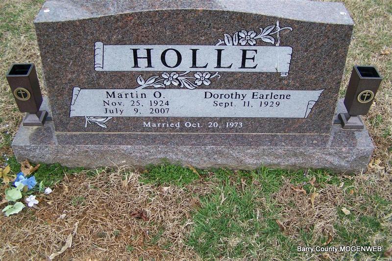 SSW: Dorothy Earlene - Research Note: Martin O. Holle, age 82, of Pierce City, died July 9, 2007, at Lawrence County Manor in Mt. Vernon. He was born November 25, 1924, in Freistatt, and was a son of Carl and Selma (Langer) Holle. He was a farmer and a member of St. John's Lutheran Church. He was preceded in death by one brother, Walter Holle. - Martin O. Holle, age 25, first married Ella Dean Peterson, age 17, on Apr. 2, 1950 in Monett, Lawrence Co., MO. Esther Peterson, mother of Ella, gave consent. She second married Carl Edward Volkl. - Photo of Military stone at findagrave.com by Connie Stockton Schmidt. Inscription: "S Sgt, US Army, WW II". | Photo Don Warner Monett Times July 10, 2007 Donna Cooper MO Marriage Records Phyllis Long |