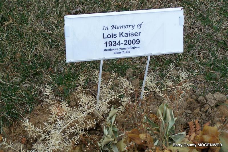 Research Note: Funeral home marker. - Lois Kaiser, age 75, of Pierce City, died February 15 at her home. She was born February 13, 1934, in Freistatt, and was a daughter of Gerhardt Schoen and Hilda (Osterloh) Schoen. She retired in 1998 from Schreiber Foods in Monett. She was secretary at Liberty Neighborhood Watch, Lutheran Brail, and Lutheran Women's League at St. John's Lutheran Church. She married Paul Kaiser on January 3, 1954, in Freistatt. She was preceded in death by one brother, Kenneth Schoen; and one sister, Lou Grenling. - Photo of permanent stone at findgrave.com by Connie Stockton Schmidt. SSW: Paul W. | Photo Don Warner Monett Times Feb. 17, 2009 Donna Cooper |