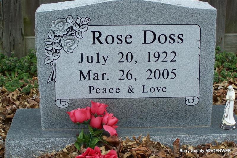 Inscription: "Peace and Love" - Research Note: Rose Doss, age 82, of Monett, died March 26, 2005, at her home. She was born July 20, 1922, in Freistatt, and was a daughter of William and Henrietta (Krueger) Koenemann. She worked at Tyson of Monett and retired from Schreiber Foods in quality control. She was preceded in death by three brothers, Alvin, Edgar, and Vernon Koenemann. - Rose I. Koenemann, age 25, married Roy C. Doss, age 26, on Apr. 25, 1948 in Monett, Barry Co., MO. | Photo Don Warner Monett Times Mar. 28, 2005 Donna Cooper MO Marriage Records Phyllis Long |