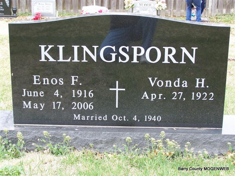 SSW: Vonda H. - Inscription: "Married Oct. 4, 1940" - Research Note: Enos Frank Klingsporn, age 89, of Monett, died May 17, at Monett Health Care Center. He was born June 4, 1916, in Cole Camp, and was a son of Otto and Frieda (Kaiser) Klingsporn. He owned and operated Hull Express and was a member of St. John's Lutheran Church in Monett. He married Vonda LaLoge on October 4, 1940, in Carthage, MO. | Photo Don Warner Monett Times May 17, 2006 Donna Cooper |