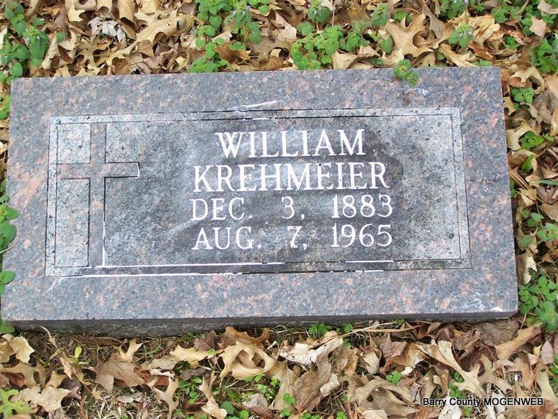 | KREHMEIER, William Carl Fredrick | Dec. 3, 1883 | Aug. 7, 1965 | Research Note: Son of Ernest Krehmeier and Fredrica Kockmeyer. William Kremeier, age 22, married Charlotte Klingsporn, age 33, on Oct. 15, 1905 in Freistatt, Lawrence Co., MO. | Photo Don Warner Census MO Marriage Records Phyllis Long |