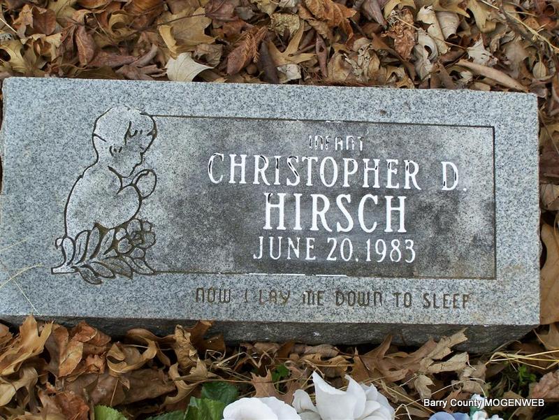 | HIRSCH, Christopher | No Date | June 20, 1983 | Inscription: "Infant" - Research Note: Son of Jerry and Joyce (Renfro) Hirsch. | Photo Don Warner Brother's Obit Phyllis Long |