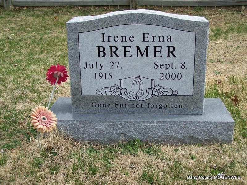 Inscription: "Gone But Not Forgotten" - Research Note: Irene Erna Bremer, age 85, of Freistatt, died Sep. 8, 2000, at her home. She was born July 27, 1915, in Freistatt, and was a daughter of Arnold and Julie (Schoen) Kaiser. She was a lifelong Freistatt resident. She married Erhard F. Bremer on December 6, 1944, in Pittsburg, KS, and he preceded her in death September 4, 1961. She was preceded in death by one son, Lamuel Bremer. | Photo Don Warner Monett Times Sept. 11, 2000 Donna Cooper |