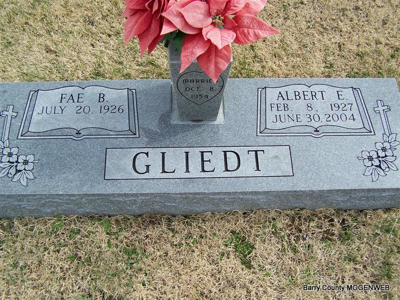 SSW: Fae B. - Inscription: "Married Oct. 8, 1954" - Research Note: Albert E. Gliedt, age 77, of Bella Vista, AR, formerly of Monett, died June 30 in Waterloo, Iowa. He was born Feb. 8, 1927, in Chester, IL, and was a son of Martin Robert and Alma Clara (Lampe) Gliedt. He was a member of the Lutheran Church in Bella Vista, AR, and former member of St. John's Lutheran Church in Monett. He was an Army veteran of World War II and an Air Force veteran of the Korean War. He married Fae Bateman on October 8, 1954, in Sacramento, California. - Photo of Military stone at findagrave.com by Connie Stockton Schmidt. Inscription: "1st LT, US, Air Force, US Army, WW II, Korea". | Photo Don Warner Monett Times July 2, 2004 Donna Cooper |