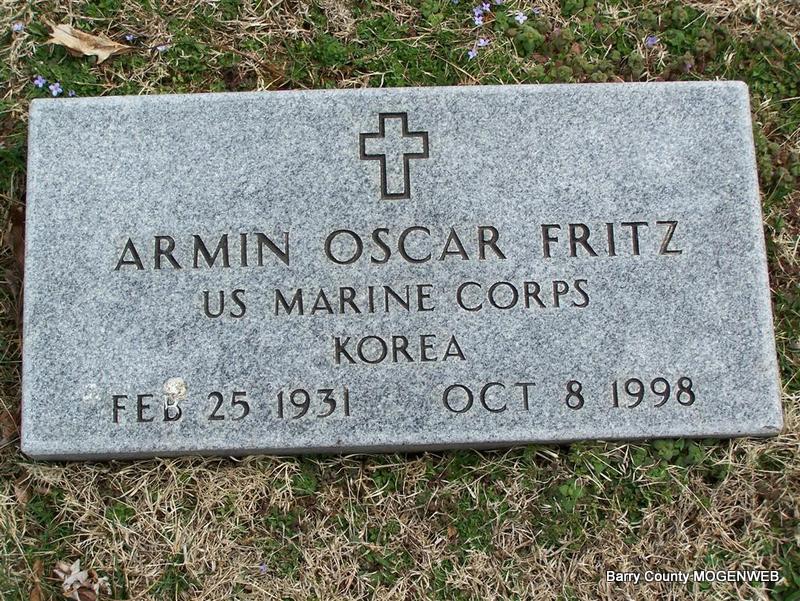 | FRITZ, Orbin E. | Jan. 7, 1936 | Mar. 20, 1989 | Research Note: Photo of Military stone at findagrave.com by Connie. Inscription: "S113, US Navy, Korea". Son of Harold E. Fritz and Dora L. Doennig. | Headstone Connie Stockton Schmidt Census Phyllis Long |