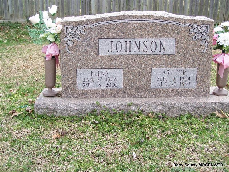 SSW: Arthur - Research Note: Ellna Elizabeth Johnson, age 92, of Monett, died September 8, 2000, at Cox Monett Hospital. She was born January 27, 1908, in Freistatt, and was a daughter of Charles H. and Martha E. (Fellwock) Doennig. She was a lifelong resident of the Monett and Pierce City areas. She married Arthur Theodore Johnson on April 12, 1934, in Joplin, and he preceded her in death August 27, 1991. She was preceded in death by one son, Roger Johnson, on April 30, 1983; and one sister, Dora Fritz, in 1988. | Photo Don Warner Monett Times Sept. 11, 2000 Donna Cooper |
