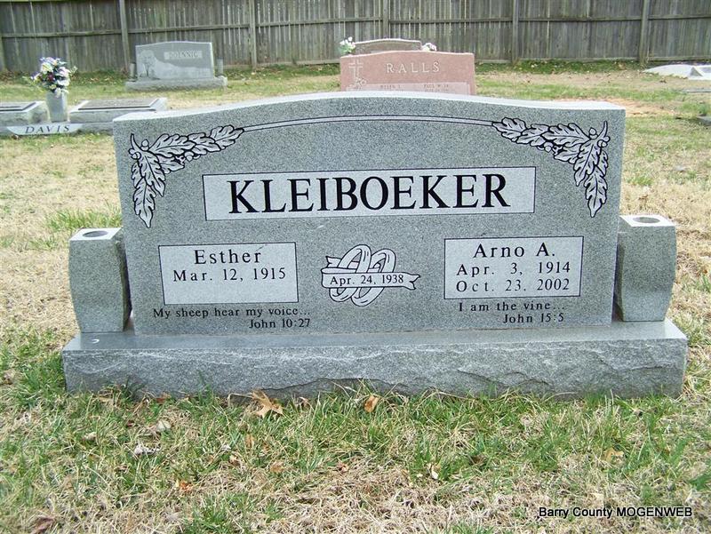 SSW: Arno A. - Inscription: "April 24, 1938" - Research Note: She was the daughter of Louis and Bertha (Kayhs) Frederking. At the age of fifteen, Esther worked as a domestic for the Baer family of St. Louis. On one occasion she met Amelia Earhart, famed aviatrix, in St. Louis, MO. On April 24, 1938 she and Arno Kleiboeker were married, sharing sixty-four years before his death in 2002. Esther assisted her husband in his business activities, as well as selling Avon products for a number of years. She was also a census taker. In the 1970's she served in the hospital auxiliary for St. Vincent's Hospital in Monett. She volunteered at Loaves and Fishes for 27 years and was the chairwoman of the meal packers for a number of years. For 38 years, Esther worked as a committee woman for the Lawrence County Republican Central Committee, supporting this committee for 34 years. In 1998 she received the Rosemary Pitt Award from the state of Missouri for her exemplary service in electoral matters. She was a faithful lifelong member of the Lutheran Church Missouri Synod and participated in many church activities including LWML, Friend's Club, Ladies Aid and the Braille Society. At the age of 98 she joined the American Legion Auxiliary in Freistatt. Preceding her in death were one daughter, Judith (Kleiboeker) Frieders, in 1968. | Photo Don Warner Buchanan Funeral Home Phyllis Long |