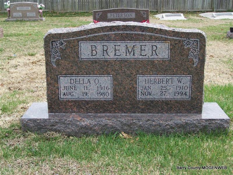 | BREMER, Della O. (BROCKSCHMIDT) | June 11, 1916 | Aug. 19, 1980 | SSW: Herbert W. - Research Note: Daughter of Richard Henry John and Rosette Brockschmidt. Della Brockschmidt, age 21, married Herbert Bremer, age 27, on Aug. 1, 1937 in Freistatt, Lawrence Co., MO. | Photo Don Warner Census MO Marriage Records Phyllis Long |