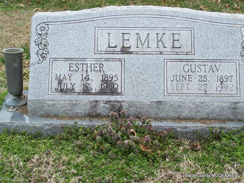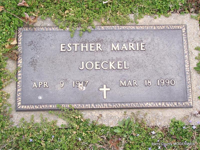 | JOECKEL, Esther Marie (OTT) | Apr. 9, 1917 | Mar. 18, 1990 | Research Note: Daughter of Fred and Minnie Ott. Esther Ott, age 28, married Edgar Joeckel, age 31, on Dec. 28, in Lockwood, Dade Co., MO. Buried next to Edgar E. Joeckel. Photos of both stones together at findgrave.com by Connie Stockton Schmidt. | Photo Don Warner MO Marriage Records Census Phyllis Long |