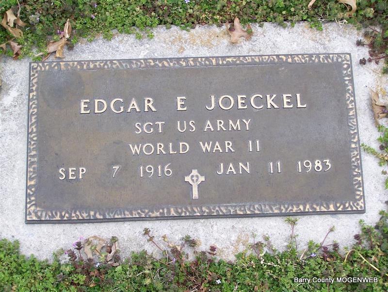 | JOECKEL, Edgar E. | Sept. 7, 1916 | Jan. 11, 1983 | Inscription: "SGT US ARMY WORLD WAR II" - Research Note: Son of Benjamin and Augusta Joeckel. Buried next to Esther Marie Joeckel. Photos of both stones together at findgrave.com by Connie Stockton Schmidt. | Photo Don Warner Census Phyllis Long |