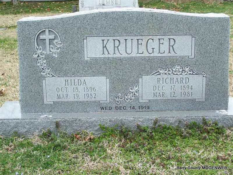 | KRUEGER, Richard Ludwig | Dec. 17, 1894 | Mar. 12, 1981 | SSW: Hilda - Inscription: "Wed Dec. 14, 1919" - Research Note: Son of Gustav Krueger and Maria Emily Gruenke. Photo of Military stone at findagrave.com by Connie Stockton Schmidt. Inscription: "PFC, US Army, WW I" | Photo Don Warner Census Phyllis Long |