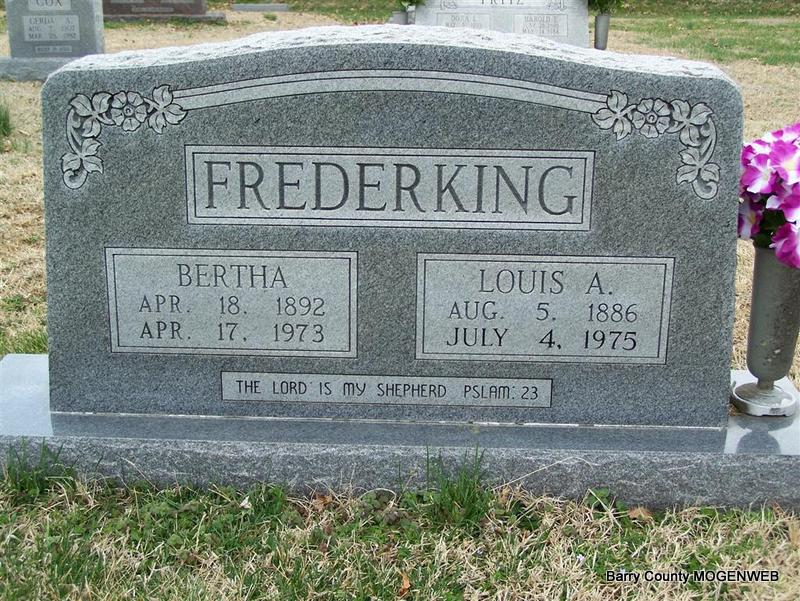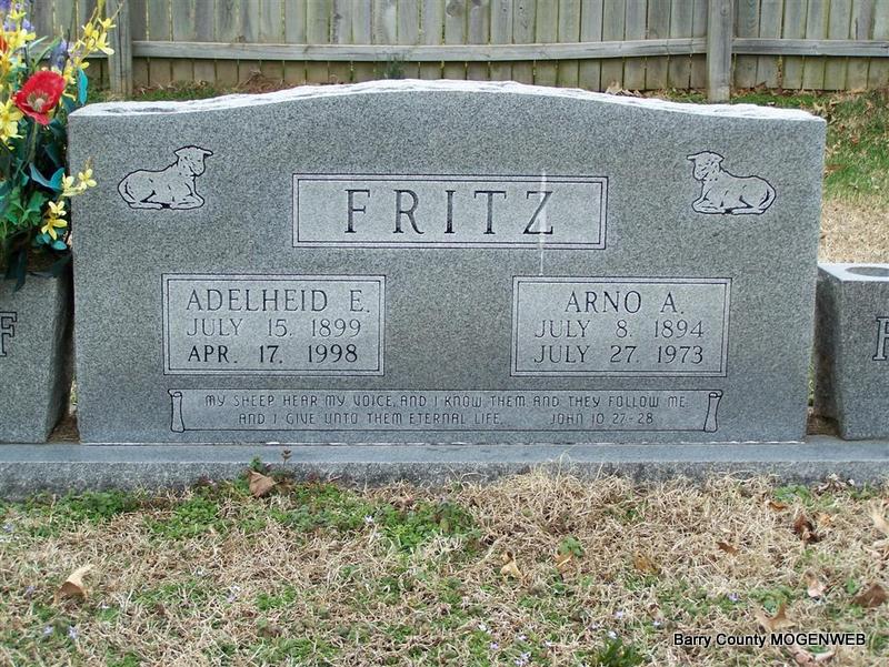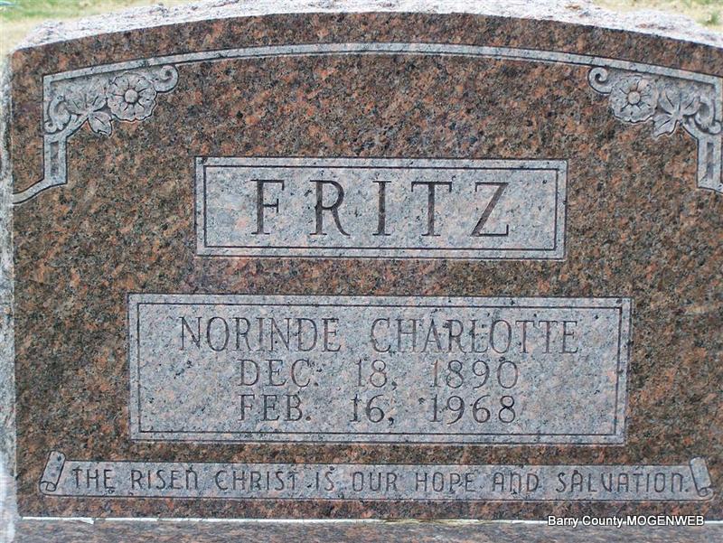 | FRITZ, Norinde Charlotte (KAISER) | Dec. 18, 1890 | Feb. 16, 1968 | Research Note: Daughter of August R. Kaiser and Wilhelmina Moeller. Norinde Kaiser, married Alvin J. Fritz on Mar. 1, 1925 in Freistatt, Lawrence Co., MO. | Photo Don Warner Census MO Marriage Records Phyllis Long |