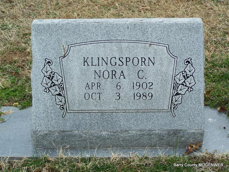 SSW: Enos F. - Inscription: "Married Oct. 4, 1940" - Research Note: She was the first child of Leo Isador R. and Esther (Bullard) LaLoge. She was preceded in death by her husband Enos F. Klingsporn, brothers Delbert LaLoge and John Maxwell, and a sister Ruby (LaLoge) Childress. Mrs. Klingsporn came to Monett as a teenager and remained. She was a longtime employee and manager of Norris Grain Company on Front Street. | Photo Don Warner Bennett-Wormington Funeral Home, Phyllis Long |