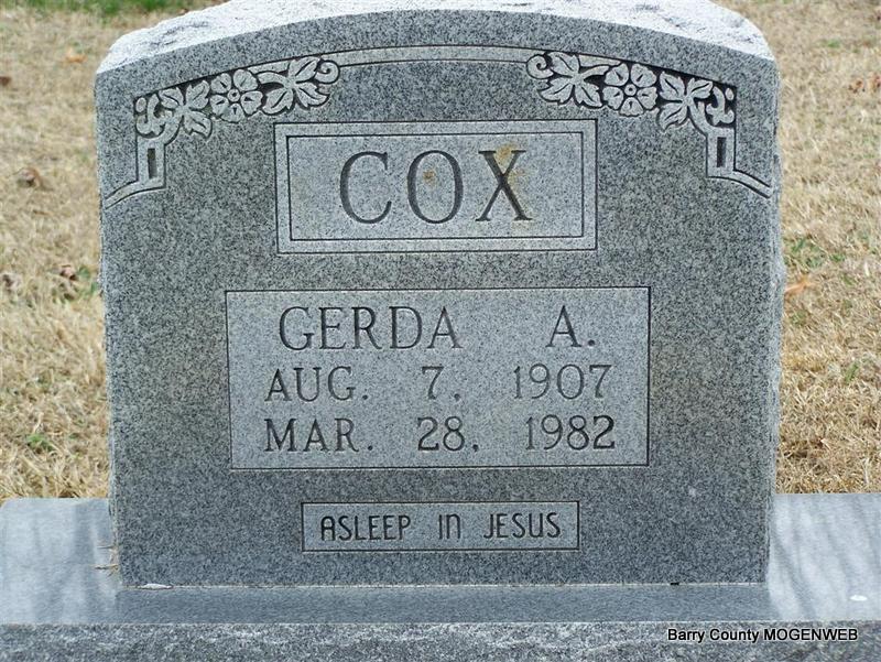 | COX, Gerda A. (FRITZ) | Aug. 7, 1907 | Mar. 28, 1982 | Research Note: Daughter of Adolph Gustav Fritz and Anna E. Stellwagon. Wife of Basil Monroe Cox. Basil is buried at Cox Cemetery, Monett, Lawrence Co., MO. | Photo Don Warner Census Phyllis Long |