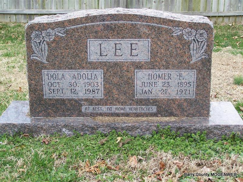 | LEE, Homer F. | June 23, 1895 | Jan. 27, 1971 | SSW: Dola Adolia - Research Note: Son of William Monroe Lee and Sarah Elizabeth Allen. Photo of Military stone at findagrave.com by Connie Stockton Schmidt. Inscription: "Missouri, MUS 3, CL 311, Cavalry, WW I". | Photo Don Warner Census Phyllis Long |