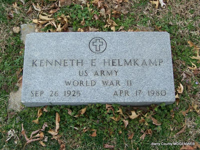 | HELMKAMP, Kenneth E. | Sept. 26, 1925 | Apr. 17, 1980 | Inscription: "US ARMY WORLD WAR II" - Research Note: Son of William E. Helmkamp and Frieda A. Kaiser. Kenneth E. Helmkamp, age 21, married Luella R. Tiesel, age 18, on Nov. 14, 1945 in Freistatt, Lawrence Co., MO. | Photo Don Warner Census MO Marriage Records Phyllis Long |