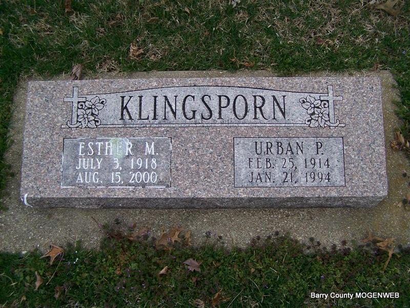 SSW: Urban P. - Research Note: Esther M. Klingsporn, age 82, of Monett, died August 15, at Monett Health Care Center. She was born July 3, 1918, in Freistatt, and was a daughter of William and Anna( Moenkhoff) Doss. She was a lifelong area of the Freistatt and Monett areas. She was employed for many years at the Dairy Queen in Monett and was a member of the St. John's Lutheran Church in Monett. She married Urban Klingsporn on September 9, 1939, in Monett, and he preceded her in death January 21, 1994. She was preceded in death by one brother, Arno Doss; and three sisters, Rosa Hesemann, Elda Layman, and Lora Doss. | Photo Don Warner Monett Times Aug. 16, 2000 Donna Cooper |