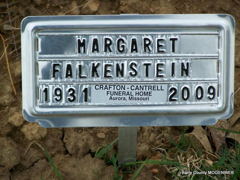 Research Note: Temporary Marker. Margaret E. Falkenstein, age 78, of Aurora, died January 19, 2009 at St. John's Regional Health Center in Springfield. She was born January 16, 1931, in Pineville, and was a daughter of Perry and Gladys (Smith) Pierce. She was a 1948 graduate of Purdy High School and was retired from MWM Color Press in Aurora. She was a member of Grace Lutheran Church in Aurora. She married Edgar Falkenstein on July 5, 1957, in Freistatt, MO. Photo of stone at findagrave.com by Connie Stockton Schmidt. SSW: Edgar G. | Monett Times Jan. 21, 2009 Donna Cooper |