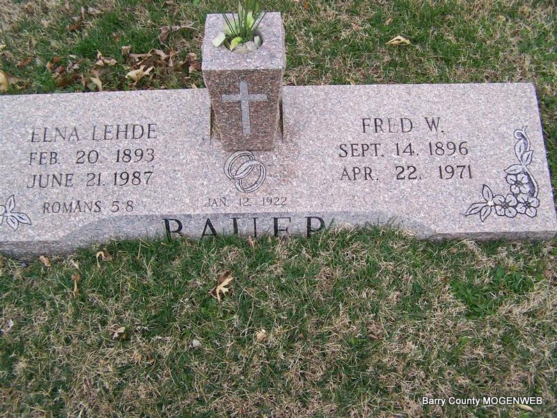 | BAUER, Elna (LEHDE) | Feb. 20, 1893 | June 21, 1987 | SSW: Fred W. - Research Note: Photo at findagrave.com by Connie. Wife of Fred W. Bauer. Fred w. Bauer married Elna D. Lehde on Jan. 12, 1922 in Freistatt, Lawrence Co., MO. Daughter of Fred and Anna Lehde. | Headstone Connie Stockton Schmidt MO Marriage Records Census Phyllis Long |
