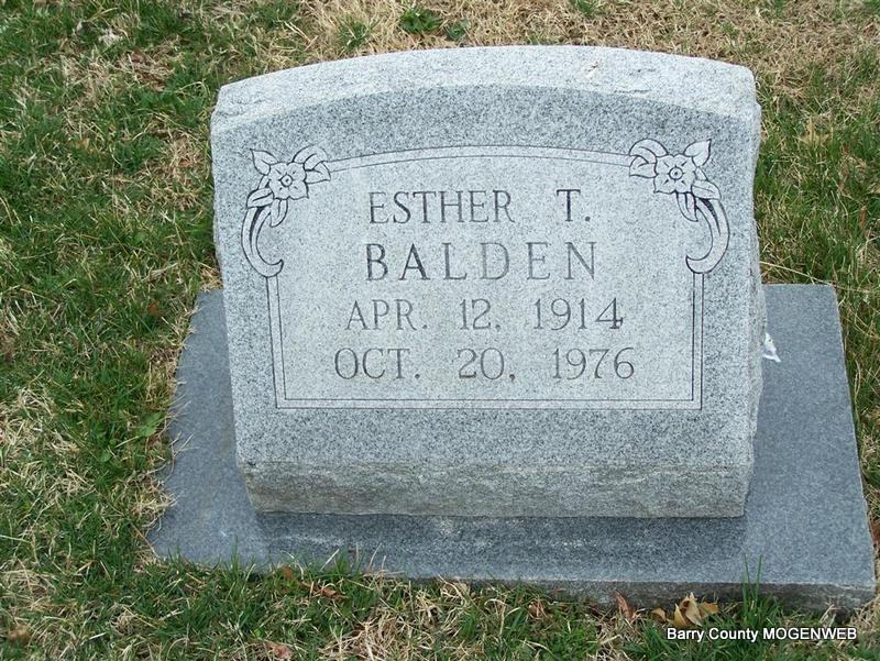 | BALDEN, Esther T. | Apr. 12, 1914 | Oct. 20, 1976 | Research Note: First wife of George Henry Balden. | Photo Don Warner Census Phyllis Long |