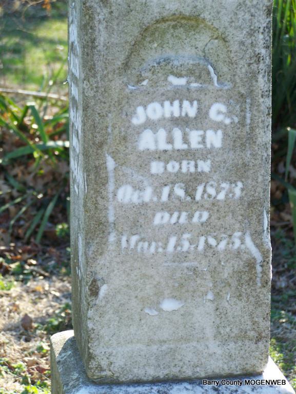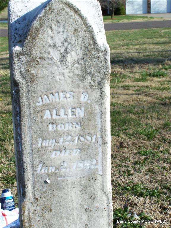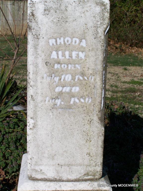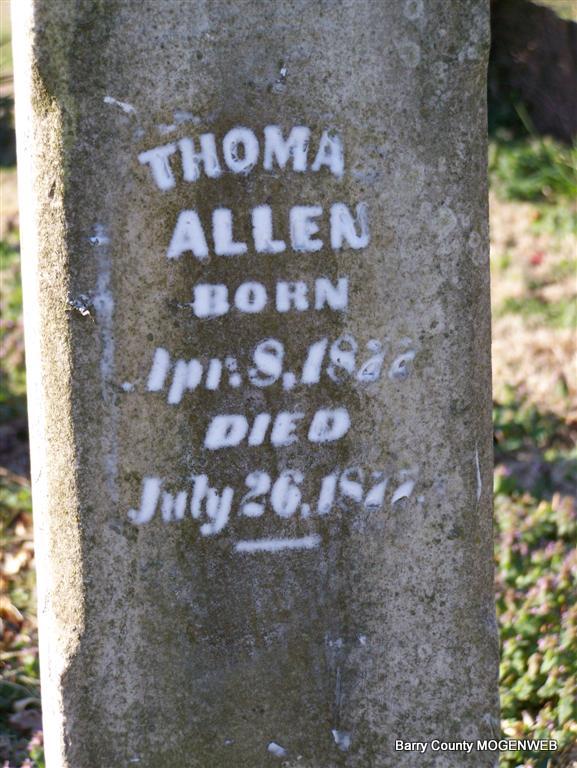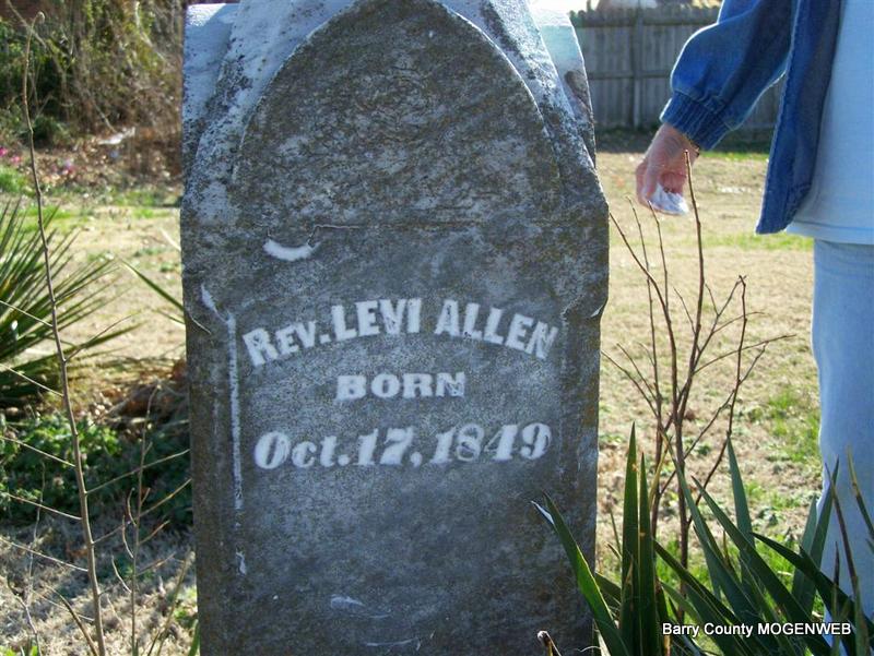 Research Note: Callaway Funeral Home buried Rev. Levi Allen on Feb. 18, 1909. He was age 59 years and 4 mos. old. He was a farmer and a minister. The cause of his death was bowel trouble. Michael Stone's post: Rev. Levi Allen, is the son of Cornell Tipton Porter and Lucinda (Curtis) Allen. His full name was Levi Meshack Abendego Thomas Allen. Nancy E. Allen, was Levi's first wife, Nancy Elizabeth Marshall. She was the daughter of Thomas H. Marshall and Sarah Elizabeth Meser. All the other Allens in this cemetery, are assumed to be their children. Levi remarried on Apr. 25, 1899, to Sarah E. Bailie, in Barry Co. | Photo Don Warner Callaway Funeral Home Donna Cooper Note Michael Stone |