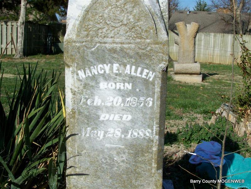| ALLEN, Nancy Elizabeth (MARSHALL) | Feb. 20, 1856 | May 28, 1888 | Research Note: Nancy E. Allen, was Levi's first wife, Nancy Elizabeth Marshall. She was the daughter of Thomas H. Marshall and Sarah Elizabeth Meser. She married Levi Allen on June 22, 1871 in Lawrence Co. MO at the home of the bride's mother. 5 children known to have lived. | Photo Don Warner Note Michael Stone |