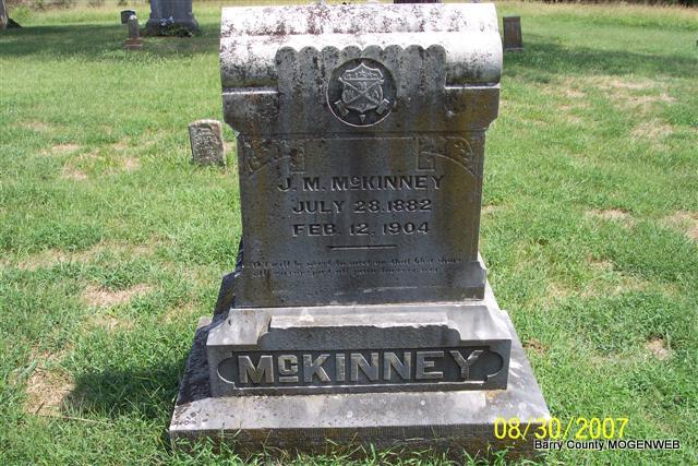 Research Note: MWA symbol on stone - Saturday, Feb. 13, 1904, Cassville Democrat - Friday morning, Feb. 12, 1904, as the light of another day was peeping from over the eastern hills, the angel of earth visited James Monroe McKinney and the spirit took flight to the realms of the great unknown, after eight days of illness of pneumonia, at the home of his uncle and aunt, Mr. and Mrs. N. L. Hailey, age 21 years, 6 months, and 13 days. All that mortal hands could do for Roy's relief was done by loving relatives and friends, but in vain. One year ago, Jan. 1, 1903, Roy accepted a position as Recorder Galloway's official deputy Recorder and faithfully discharged his duties in that position, and had made many friends by his gentlemanly ways and prompt attention to business. He was a son of Edward and Alice (Hailey) McKinney and was born at Hailey Post Office, July 28, 1882. He was a regular attendant at the Union Sunday School and taught a class of young ladies, who were very much attached to him. Wherever Roy was known, sadness prevails the household. The remains were laid to rest in the McKinney Cemetery near Hailey Post Office, today, Saturday with the honors of the Modern Woodman and Royal Neighbor societies. The remains will leave this city, today, Saturday, at 9 a. m. and the interment will take place as soon as they can be conveyed to that place. Funeral services were held Friday at 2:30 p.m., by Rev. McCracken at the residence of N. L. Hailey in this city. - Back of Stone | Online Obit Phyllis Long Photo Diana Cope |