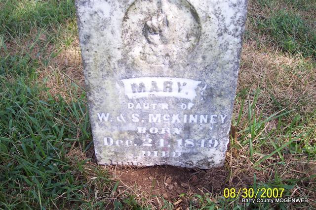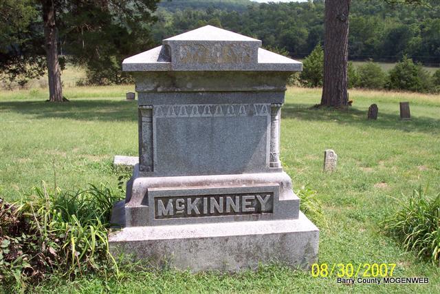 Inscription: "Father" - Research Note: He was widowed and a grain farmer. He was a son of William McKinney and Sallie Legg, both born AL. J. B. Jones? of Cassville, MO was the informant. Death certificate is indexed on the MO Archives web site as Edward W. McKinney. It has birth year as 1855. Stone has 1853. He first married Alice Newton Hailey. He second married Cordie McCary on Jan. 5, 1893 in Barry Co., MO. - On the 1900 Census Mineral Spring, Barry, Missouri, he is listed as E. M. McKinney, born Dec. 1853, widowed, married in 1885 and was married for 15 years. Children are listed as Ray age 17, Myrtle age 16, Allie age 13, and Grover age 8. - Cassville Democrat - When the curtain of life was lowered, closing the scenes of the earth from human sight, it was the finishing up of a well spent life, of a man who practiced the golden rule toward all mankind, by treating all as he would like to be treated. Every days actions illustrated a splendid manhood of excellent principles that caused him to be held in the highest estimation by all who had the pleasure of his acquaintance. He was unassuming, quiet and retired, but his honesty of purpose and character was so resplendent that he did not lack for the confidence of his fellow man. His neighbors loved him, because of his manly principles and kindness exhibited to them. He was hospitable to strangers and friends and they were ever extended a hearty welcome to his home. Edward Monroe McKinney was born on the farm where he died, Dec. 25, 1853, and died March 29, 1917, of a heart trouble and lagrippe, aged 63 years, 3 months and 4 days. He was a son of the late Wm. and Sallie (Legg) McKinney, who came from Alabama, to Barry County in 1841, and located on Rock House Creek, where he lived and died. They were natives of Tennessee. Mrs. McKinney died at Berryville, Ark., in October, 1865, aged 51 years, and was interred there. Mr. McKinney died at the old home, Dec. 31, 1891. They both enjoyed the good will and esteem of all their acquaintances. Edward grew to manhood on the McKinney homestead and on Jan. 15, 1879, he and Miss Alice Newton Hailey were married and to this union were born Eschel McKinney of Kenova, Okla., Mrs. W. C. Potter who lived at home with her father, Mrs. Ollie Norris of Indiana, and Grover somewhere in the west. The wife died in 1892, and in 1894, he and Miss Cordie McCary of near this city were married; she died Jan. 15, 1895, one child was born of this marriage and it died in infancy. He was a brother of the late Wm. James, John, Mrs. Wm. Suttles, and Mrs. N. L. Hailey of this city, Mrs. Celia Vance of Richland, N. M., and Thos. McKinney of Shawnee, Okla. Many sorrowing relatives and friends attended the funeral. Rev. J. W. Ennis of near this city, conducted impressive funeral services at the McKinney home, March 30, and very feeling referred to the life of the deceased as being an upright and honest citizen, who had made the acknowledgement of a God in whom he trusted. Barry county has lost a good citizen and his passing is regretted by a large number of people. - Cassville Democrat - Edward (Ned) McKinney died Thursday, March 29, at his home near Hailey at the age of 61 years, following a brief illness of lagrippe and pneumonia. Only a few days before the death he contracted a severe attack of what was thought to be only lagrippe but pneumonia soon developed and before many of his friends even knew of his illness, he had passed away. Impressive funeral services were held at the home Friday, conducted by Rev. J. W. Ennes and his body was laid to rest in the family burial ground on the McKinney old homestead. Edward McKinney was the youngest son of the late William McKinney, a pioneer citizen of this county who emigrated from Alabama and settled the McKinney old homestead near Hailey in 1841. Edward McKinney's grandfather was a native of Culpepper county, Virginia. The family moved to Tennessee and after Alabama became a state they moved to Alabama and lived there until they came to Barry County, Missouri, in 1841. In those pioneer days game was plentiful and the population very sparse and this county offered a splendid opportunity for the pioneer family. Edward McKinney was born Dec. 25, 1853 on the farm settled eleven years before by his parents. His entire life, except perhaps a brief time during the Civil War, was spent in Barry County and in the locality where his parents' settled 76 years ago. For many years he has been known as one of this county's most substantial farmers. About the year 1880 he was married to Miss Alice Hailey. To them seven children were born, four of whom are living. They are W. E. McKinney of Konawa, Okla., Myrtle, wife of Will Potter of near Jenkins; Alice Norris of Indiana and Grover of Seattle, Wash. Mrs. McKinney died many years ago. Later he married Miss Cordie McCary, youngest daughter of the late Henry McCary. To them one child was born, but died at the age of two years. Mrs. Cordie McCary McKinney lived only a year of two after the marriage. He leaves one brother, Thos. C. McKinney of Shawnee, Okla., and two sisters, Mrs. Celia Vance of Richland, New Mexico and Mrs. N. L. Hailey of this city. Mr. McKinney was a prosperous farmer and recognized as one of the best in the county. He was the very soul of honor and enjoyed the highest esteem of a large circle of friends. In his passing Barry County loses one of her most worthy citizens. | Death Certificate Online Obits MO Marriage Records Phyllis Long Photo Diana Cope |