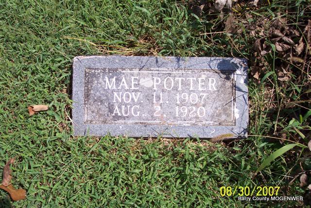 | POTTER, Mae | Nov. 11, 1907 | Aug. 2, 1920 | Research Note: Daughter of William C. Potter and Myrtle A. McKinney. - November 30, 1907, Saturday, Cassville Democrat - Jenkins City News: Born to Mr. and Mrs. Will Potter the 10th, a dishwasher. Monett and babe getting along nicely. - May 19, 1917, Saturday, Cassville Democrat - Mrs. W. C. Potter of near Hailey, took her little afflicted daughter to Springfield, this week, during the State Medical Society Meeting, and had eminent surgeons to pass on her condition. They pronounced her troubles a tumor or cancer on the brain and that the results of an operation would be doubtful. - August 21, 1920, Cassville Democrat - Mae Potter was born in Jenkins, Nov. 11, 1907, and died Aug. 2nd, 1920, of cysto leptomeningitis, age 12 years, 8 months, and 22 days, at the home of her parents, Mr. and Mrs. W. C. Potter near Hailey post office. Rev. G. G. Cottrell of the Christian Church conducted funeral services at the home, on Aug. 4, 1920, after which the remains were interred in the McKinney Cemetery, to await a sweet resurrection. A large number of relatives and friends attended the funeral. - Cassville Democrat, August 14, 1920 - We wish to express our sincere thanks to all who so kindly aided us during sickness and death of our beloved daughter and sister, Mae. To Rev. Cottrell for his consoling words, to the choir and those that sent floral offerings, May God richly bless them and spare them from a like sorrow as long as possible, is our prayer. - Mr. and Mrs. W. C. Potter, Ralph and Nolan Potter. | Online Obit Online Newspapers Phyllis Long Photo Diana Cope |