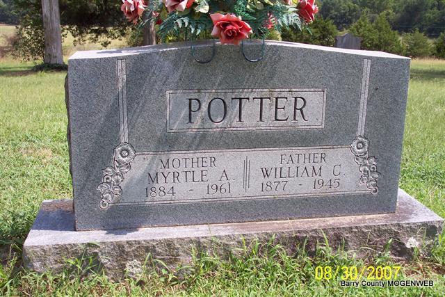 SSW: Myrtle A. - Research Note: Son of James Thomas Potter and Lucinda Short. Husband of Myrtle Ann McKinney. - December 1, 1917, Saturday, Cassville Democrat - Buys Good Farm: Wm. Potter of Hailey, has consummated a deal with the heirs of the late Edward McKinney farm that adjoins Hailey post office and consists of 400 acres for $8, 000. As Mr. Potter is in the stock business it will come in good place for he will have advantage of a large pasturage. - William Potter was the son-in-law of Edward McKinney. - Cassville Republican,Thursday, March 21, 1918 - W. C. Potter of Hailey says that his brother-in-law, Grover McKinley, who had been away from home since 1907 is now in the army and located with the aviation corps at Hempstead, L. I. - Cassville Republican, Thursday, July 25, 1918 - Cato: Will Potter has several men employed working on the canning factory. - Cassville Democrat, Saturday, Feb. 14, 1920 - W. C. Potter, who has been very sick with flu in Jenkins, is reported improving. - Cassville Democrat, March 20, 1920 - W. C. Potter is talking of closing out his business here and going to Okla. He is going to sell everything here except his home place. - Cassville Democrat, May 8, 1920 - Work will begin this Tuesday morning on tearing out the little bridge across the pond in W. C. Potter's field, which was washed out some years ago, in preparation for the construction of the new bridge. - Cassville Democrat, Sept. 4, 1920 - W. C. Potter unloaded a car load of tin cans at this place Saturday for use at his Cato Canning Factory. - Cassville Democrat, Sept. 11, 1920 - W. C. Potter of Jenkins, went to Ft. Towson, Okla., Saturday on business. - Cassville Democrat, Sept. 18, 1920 - W. C. Potter of Jenkins was in this city Tuesday and said his canning factory at Cato was doing a good business. | Headstone Lanny and Mary Headstone Note Shirley Writer Chang Online Newspapers Phyllis Long Photo Diana Cope |