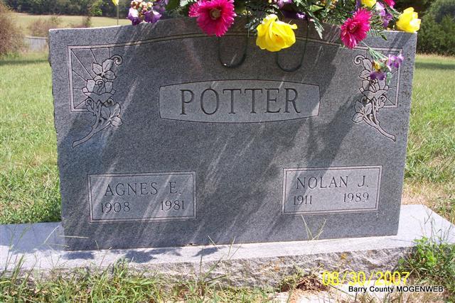 | POTTER, Agnes Elizabeth | 1908 | 1981 | SSW: Nolan J. | Headstone Lanny and Mary Photo Diana Cope |