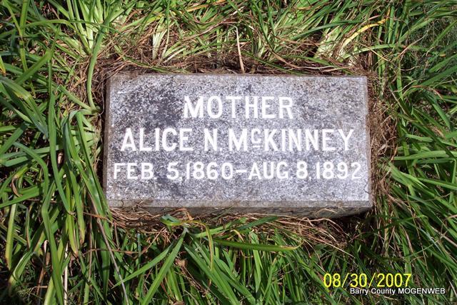 Inscription: "Mother" - Research Note: First wife of Edward M. McKinney. Daughter of Isaac Newton Hailey and Elizabeth J. Joslin. Alice Newton Hailey married Edward McKinney on Jan. 15, 1878 in Barry Co., MO. | Census MO Marriage Records Phyllis Long Headstone Lanny and Mary Photo Diana Cope |