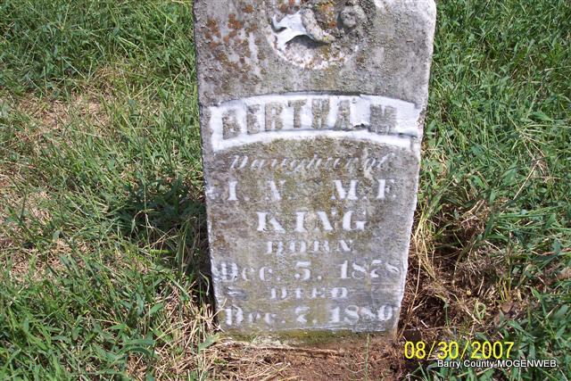 | KING, Bertha M. | Dec. 5, 1878 | Dec. 7, 1880 | Inscription: "Daughter of I. N. and M. F. King" - Research Note: Daughter of Isaac Newton King and Mary Frances Wooldridge. | Census Phyllis Long Headstone Lanny and Mary Photo Diana Cope |