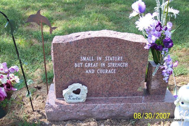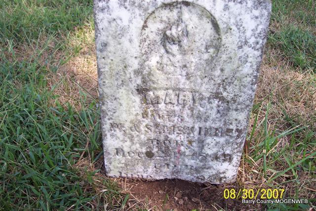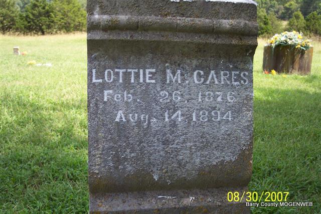 | CARES, John F. | Jan. 13, 1898 | Feb. 21, 1899 | Inscription: "Son of Mr. and Mrs. A. B. Cares" - Research Note: Son of Alfred B. Cares and Joanna Vance, married on Dec. 22, 1895 in Hailey, Barry Co., MO. Alfred was the son of Conrad and Caroline Cares. | MO Marriage Records Census Phyllis Long Photo Diana Cope |