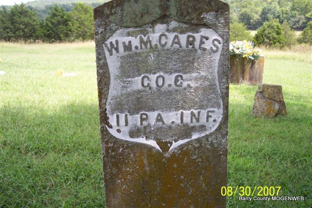 Inscription: " Co. G 11 PA. INF" - Research Note: He was single and a farmer. Son of Daniel Cares and Nancy F. Balou/Bilyou, both born Northumberland Co., PA. John W. Phillips of Hailey, MO was the informant. Phyllis' Note: William was living with his parents and siblings in 1870 Census Delaware, Northumberland Co., PA. Living with his brother Conrad F. Cares and family along with brother John in 1880 Census Neosho, Labette Co., KS. - 1900 Census Mineral Spring, Barry Co., MO, he is living alone and reported as widowed. Also on this page is brother C. F. Cares and J. W. Phillips who most likely signed the death certificate. - Cassville Republican, September 18, 1913 - W. M. Cares, one of Barry County's aged and respected citizens, dropped dead Friday of heart trouble at the home of his brother, C. F. Cares, who lives near Hailey. Mr. Cares was found in an unconscious condition on Wednesday of last week, the first time it was known that he had any aliments of heart disease. He rallied from this attack with sufficient strength to be up and about until Friday when he dropped dead from the second attack of his aliments. The deceased was 78 years of age and was born in Northumberland, Penn. early in life he became identified with the German Reformed Church and lived to it teaching through his life. He was a veteran of the Civil War, being a member of the 11th Pennsylvania Infantry. For a number of years he had lived in the Hailey locality and had the confidence and respect of the people of his community. He was never married. He is survived by two sisters, residing at McEwinsville, Penn., and two brothers, D. A. and C. F. Cares, the latter with whom he made his home. The funeral services were conducted at Hailey Saturday by Rev. J. W. Ennes and interment made at the McKinney Cemetery. - Another Photo | Headstone Lanny and Mary Death Certificate Online Obit Phyllis Long Photos Diana Cope |
