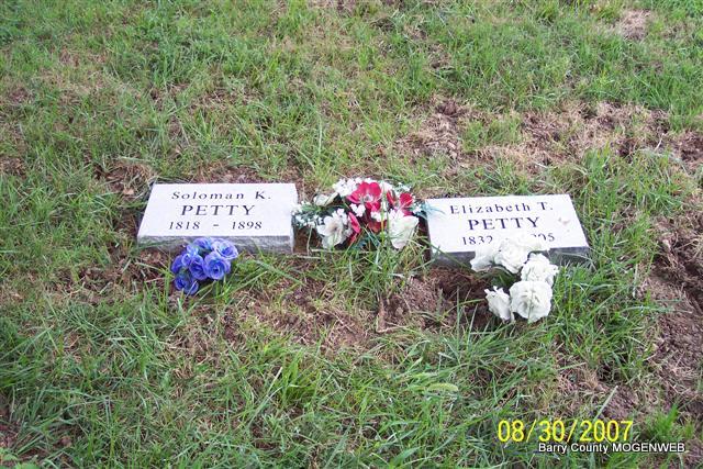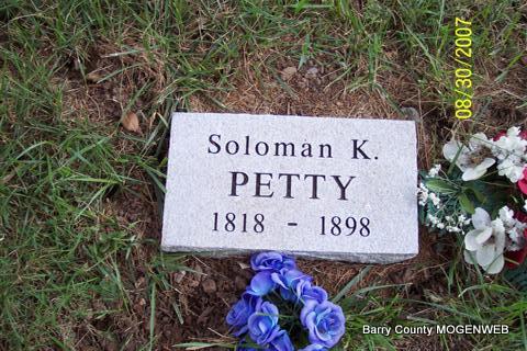 Research Note: Researchers say he was the son of Absolom Petty and Louisa D. Bailey. His first wife was Sophronia Mefford. Second wife was Elizabeth T. Sisney. - Cassville Republican, Jan. 2, 1896 - Col. Holliday, Capt. Duncan and Rev. Taylor represented the Rocky Mountains of Mineral Township Monday. They reported a pleasant time at Dr. S. K. Petty's Christmas, which was the 77th anniversary of the Doctor's birth. At the same time Rev. John A. McClure united James R. Mefford and Miss Mary Norris in marriage, in the presence of forty-one guests. - Sept. 22, 1898, Cassville Republican - Dr. Solomon Petty died at his home on Gaddis, age 79 years, 8 months, 16 days. He leaves a wife and 1 son. - Another Photo | Family History Online Obit Wayne Couch Online Newspapers Census Phyllis Long Photos Diana Cope |