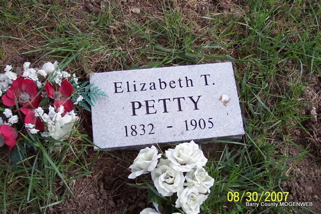 Research Note: Daughter of John Sisney and Matilda Tompkins. Elizabeth T. Sisney first married William E. McGlaughlin on May 24, 1853 in Greene Co., MO. She second married Solomon K. Petty on July 5, 1879 in Barry Co., MO. - Feb. 11, 1905, Cassville Democrat - Mrs. Petty, widow of the late Dr. Petty, died recently at her home east of town, 8 or 10 miles. - From the Cash Family Tree: Elizabeth was the second child of John and Matilda. Born 1932, Warren County, Illinois, died before 1905. She moved to Schuyler County, Missouri before 1850. First married to William E. McGaughlin, May 24, 1853, at age 20. They had one child, a girl who died at age 2. William McGaughlin is believed to have died in the Civil War. It is said that Elizabeth went to Tennessee to live for awhile, and about 1875 she rode a horse back from Tennesse to Ozark County, MO in a land rush and used a yellow willow branch to switch her horse with. She picked the branch off a yellow willow tree in Tennesse and when she found the land she wanted she pushed the branch into the ground beside a creek that was running thru her property and the willow took root and grew and spread all over the area, that was later called Willow Grove. In 1877, on July 5, she married Soloman K. Petty. He was a medicinal doctor. Elizabeth also was a doctor, only she doctored with herbs and faith. Together they became well known as good people and excellent doctors. They cured skin cancer with herbs and saved 7 months pregnant babies by putting them in the oven with a low heat and leaving the oven door open. When a young woman, Elizabeth went on a call in Marshfield, MO. While she was out and on her way home a fierce wind storm developed. She was caught in the storm and to keep from being blown away she wrapped her arms around a bush very tightly. The wind lasted a long time, it seemed like hours. She lost consciousness and as a result was left with nervous problems and suffered spasms at times. Elizabeth is registered in Cassville, MO as a doctor and is accredited with healing powers. Elizabeth and Petty moved to Barry County, MO to live. They both died there on their farm. She was still caring for the sick, making house calls until her death Feb. 6, 1905. The T in Elizabeth T. could be for Tompkins, some times girls were given their mothers maiden name as a middle name. It was handed down that the Sisneys were of German-Dutch decent. When Elizabeth died she was still black haired. - Another Photo | Family History Wayne Couch Online Newspapers Census MO Marriage Records Phyllis Long Photos Diana Cope |