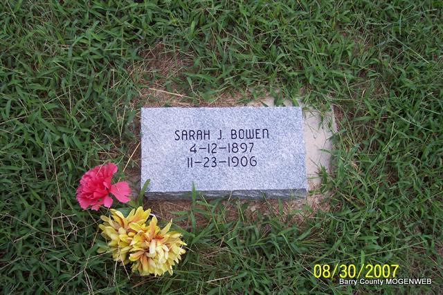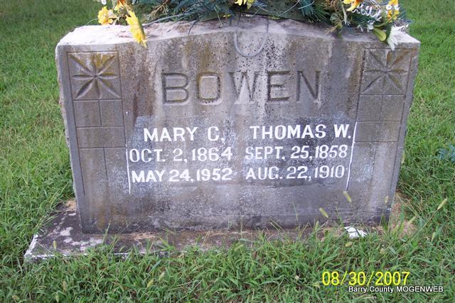 SSW: Thomas W. - Research Note: Daughter of John E. Hadley and Sarah Elizabeth Phillips, both buried at John Hadley Cemetery. Luther Bowen (son) of Cassville, MO was the informant on the death certificate. Thomas W. Bowen married Mary C. Hadley on Dec. 29, 1880. | Death Certificate MO Marriage Records Census Phyllis Long Photo Diana Cope |