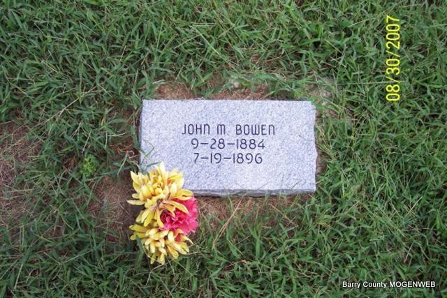 | BOWEN, John M. | Sept. 28, 1884 | July 19, 1896 | Research Note: Probably the son of Thomas W. Bowen and Mary Caroline Hadley. | Note Phyllis Long Photo Diana Cope |