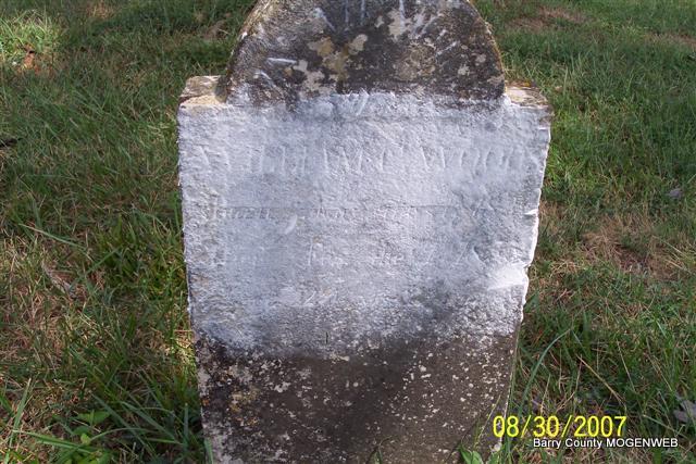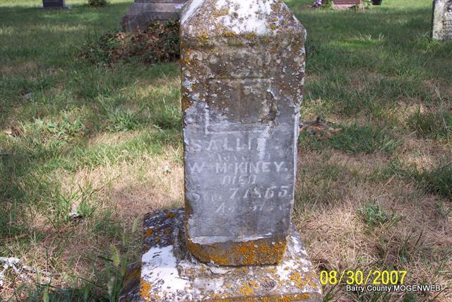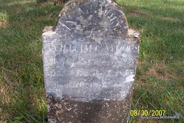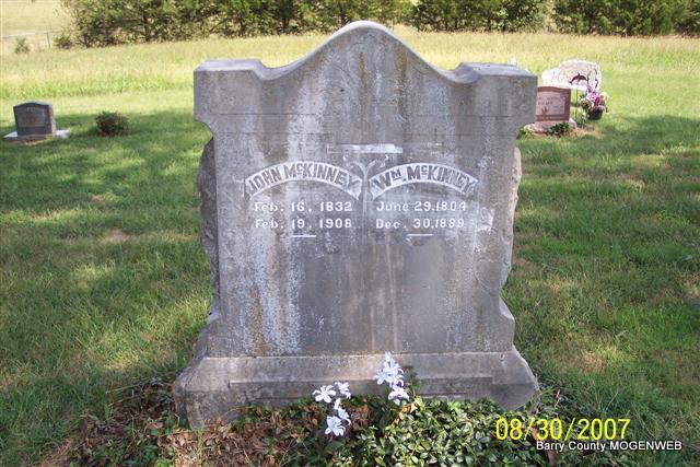 SSW: John - Research Note: Goodspeed's History of Barry Co., MO - William McKinney, one of the pioneer settlers of Barry Co., MO, was born in TN in 1804. His parents were James and Delia (Caldwell) McKinney. James McKinney was born in Culpepper Co., VA. He went from his native state to TN before Alabama became a state. When the latter was admitted to the Union he removed thither, and remained there until his death at the age of ninety years. His wife, who was the mother of nine children, lived to the extreme age of one hundred and three years. William McKinney was married in AL to Sallie Legg, a native of TN. He immigrated with his family to MO in 1841. When he first located in MO he intended to remain but a short time, feasting on the abundance of wild game and honey found there. At that time there were no more than a half dozen families in Flat Creek Valley, which is now so densely populated. Being so favorably impressed with the possibilities of SW MO, Mr. McKinney concluded to settle. He purchased a claim from a squatter, which he afterward entered when land was thrown on the market. He is one of he oldest living settlers of Barry Co., and has witnessed the vast commonwealth of MO develop from a wilderness to its present high state of cultivation and civilization. His wife died in Oct. 1865 aged fifty-one years, and Mr. McKinney is now living on the homestead with his oldest son, a bachelor in middle life and his daughter, Celia, widow of Joseph Vance. The family owns 400 acres of well improved land. Six of Mr. McKinney's children are living viz: John, Elizabeth (wife of Thomas Settles), Celia, Thomas, Nancy (wife of Newton Haley) and Edward. Some of the family are members of the Christian Church. Celia Vance's two children, Joanna and John W., also live with their grandfather. Politically, William McKinney is a Democrat. He can remember the War of 1812. | Family History Wayne Couch Goodspeed Phyllis Long Photo Diana Cope |