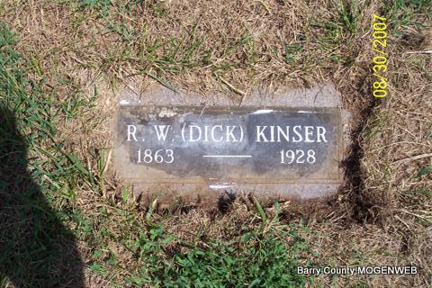 Research Note: Son of William Kinser and Mary Callahan. Brother to James R. Kinser. R. W. Kinser from Hailey, Barry Co., MO and Maud Ray from Butterfield, Barry Co., MO, were married on Dec. 24, 1904 in Barry Co., MO. Maud died in 1942 and is buried at Mt. Pleasant Cemetery as Maud (Ray) Kinser. | Census MO Marriage Records Phyllis Long Photo Diana Cope |
