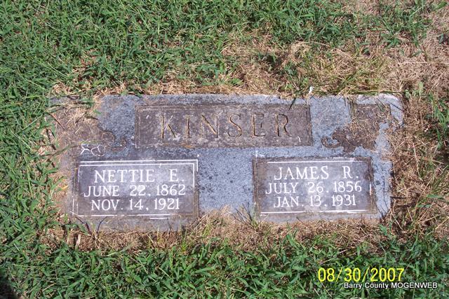 SSW: Nettie E. - Research Note: The death certificate that is registered with a Barry County death has his name as John Russell Kinser, a widower, with a birth date of July 26, 1853, and death date of Jan. 13, 1932, so the death date on the stone is not correct. His cause of death was Bright's disease. His father is given as William Kinser, born VA, and his mother as Callahan, born VA. He is given as buried in McKinney Cemetery. It is not certain if he was born in 1856 as the paper and the death certificate reads or 1853 as the stone reads. More than likely the birth date on the stone is incorrect, because it is for sure the death date is wrong. His wife in the 1930 census is Maggie, age 49 born AR. - November 13, 1909, Saturday, Cassville Democrat, Barry Co., MO - J. R. Kinser of Hailey, Mineral township, was born July 26, 1856, in Knox County, KY, and came to Missouri in 1887. Was married in 18_8 [maybe 1878 or 1898?] in Knox County, KY to Miss Nettie Randalls of that county; two children have been born of this marriage. Mr. Kinser has been a great factor in developing the mineral resources in this section, and has spent time and money in that direction. He is a successful farmer, a member of the M. E. Church and a Republican in politics. | Headstone Lanny and Mary Death Certificate Online Newspapers Donna Cooper Photo Diana Cope |